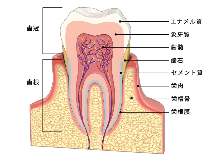 歯髄は痛みを伝達するので、虫歯やケガなどによって歯がダメージを受けていることを脳に知らせます。また、飲食物の温度や噛む感覚などを伝えることで、食事をする際の動作や食事を美味しくいただくことを支えています。さらに、歯に栄養や酸素、水分を送り続ける役割も担っており、天然歯を健康に維持することにも貢献しています。
