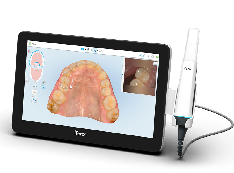 口腔内スキャナーのiTero(アイテロ)はお口の中に小型カメラのような3Dスキャナーを入れて、光学印象を撮影していきます。するとお口の中の状態がコンピューター上に再現されるので、患者様にもすぐ見ていただくことが可能です。撮影時間も短く患者様の負担も軽くなる上に、精度も高い型取りとなっております。