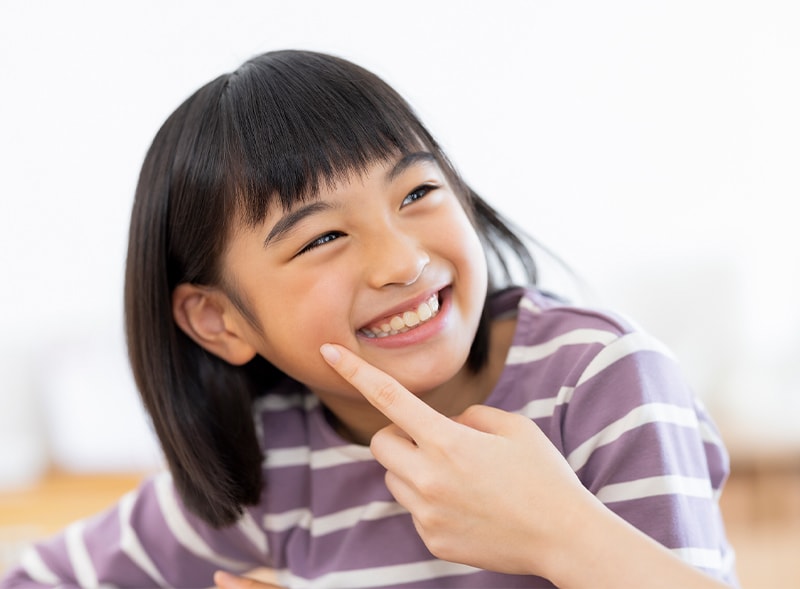 当院で行っている小児矯正の装置は口を開けても見えませんので安心してください。また、最初恥ずかしがっていてもすぐ慣れる子が大半です。見えないことやすぐ慣れることをお子さんに伝えてください。